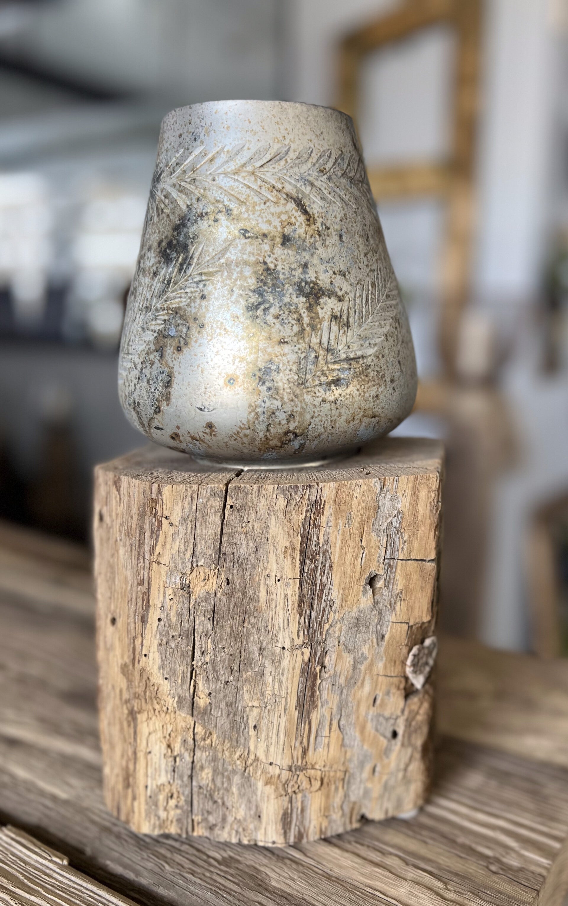 Windlicht/ Vase auf rustikalem Stück Eiche